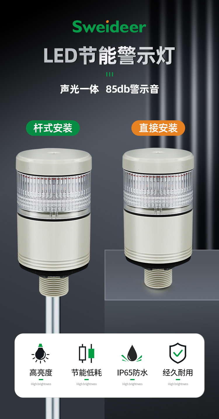 Sweideer LED节能警示灯信号灯杆式报警灯12V24V声光闪烁声光一体