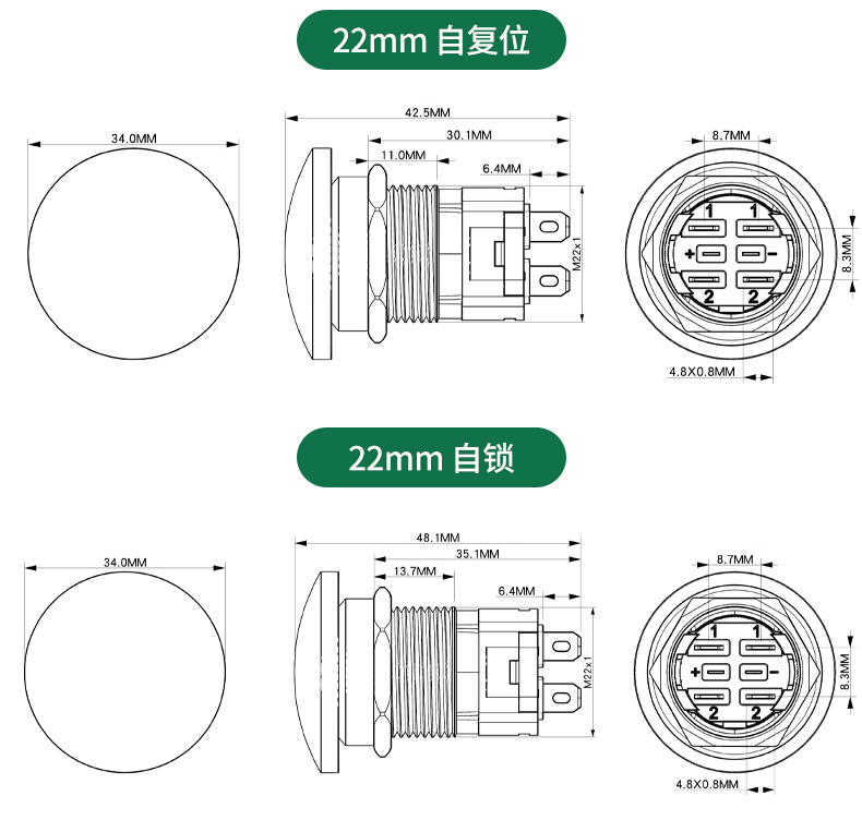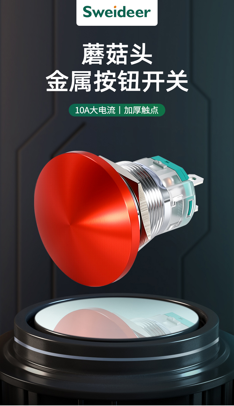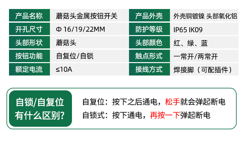 16/19/22mm 金属按钮开关蘑菇头10A大电流自复位自锁防水启动按键