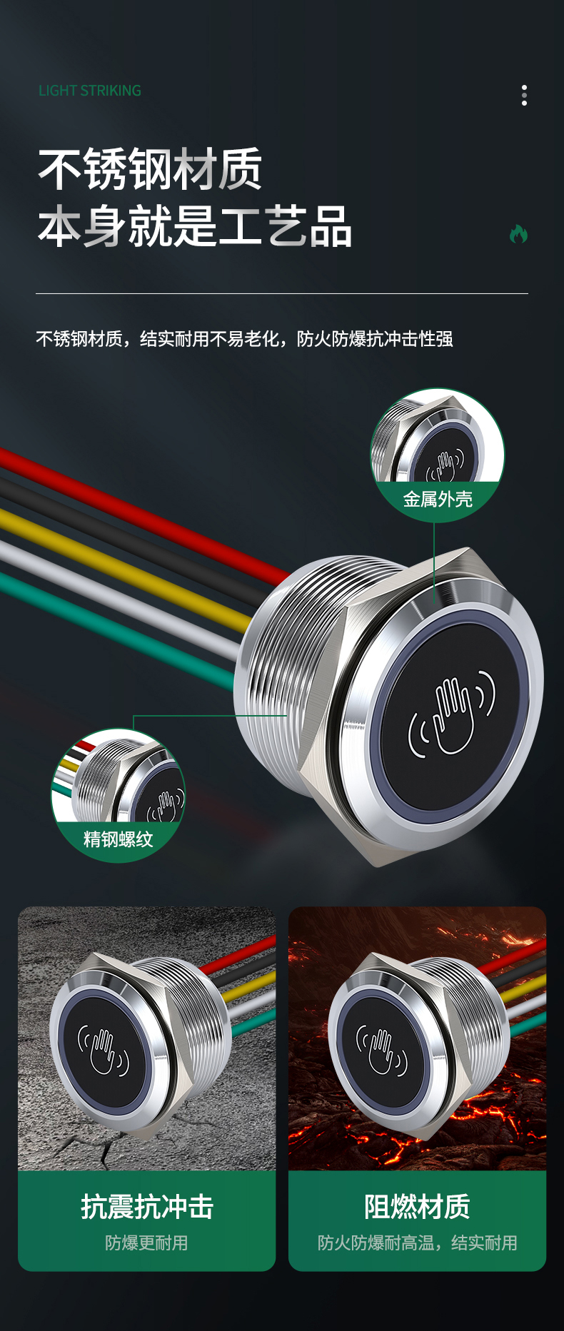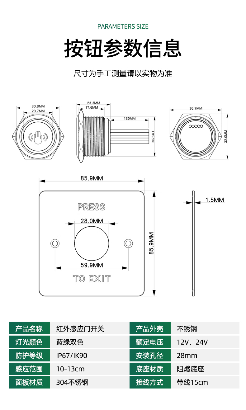 28mm红外感应门禁按钮开关86型面板不锈钢室外防水免触摸小区门禁