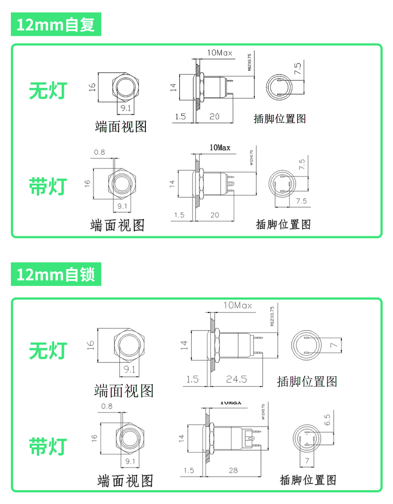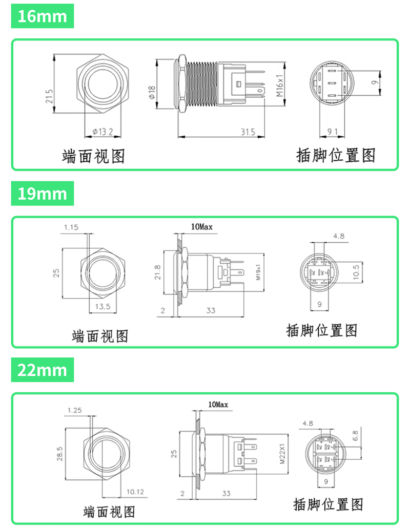 12/16/19/22mm氧化黑金属按钮开关 自复位自锁式圆形带灯电源按键