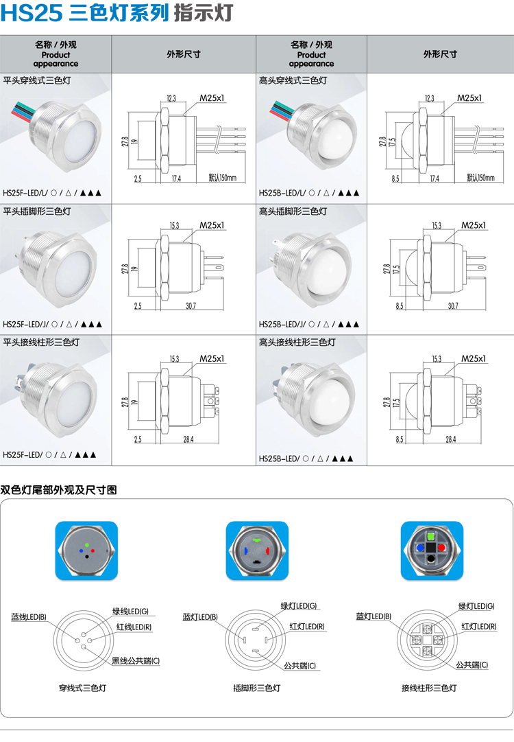 25mm金属指示灯 LED信号灯电源单双三色发光防水带线6v12v24V220v