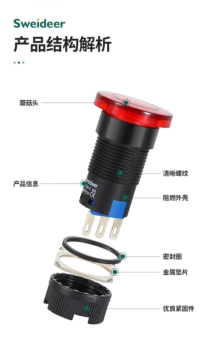 16mm带灯蘑菇头LA155-C16-11/22 M / MT / MD