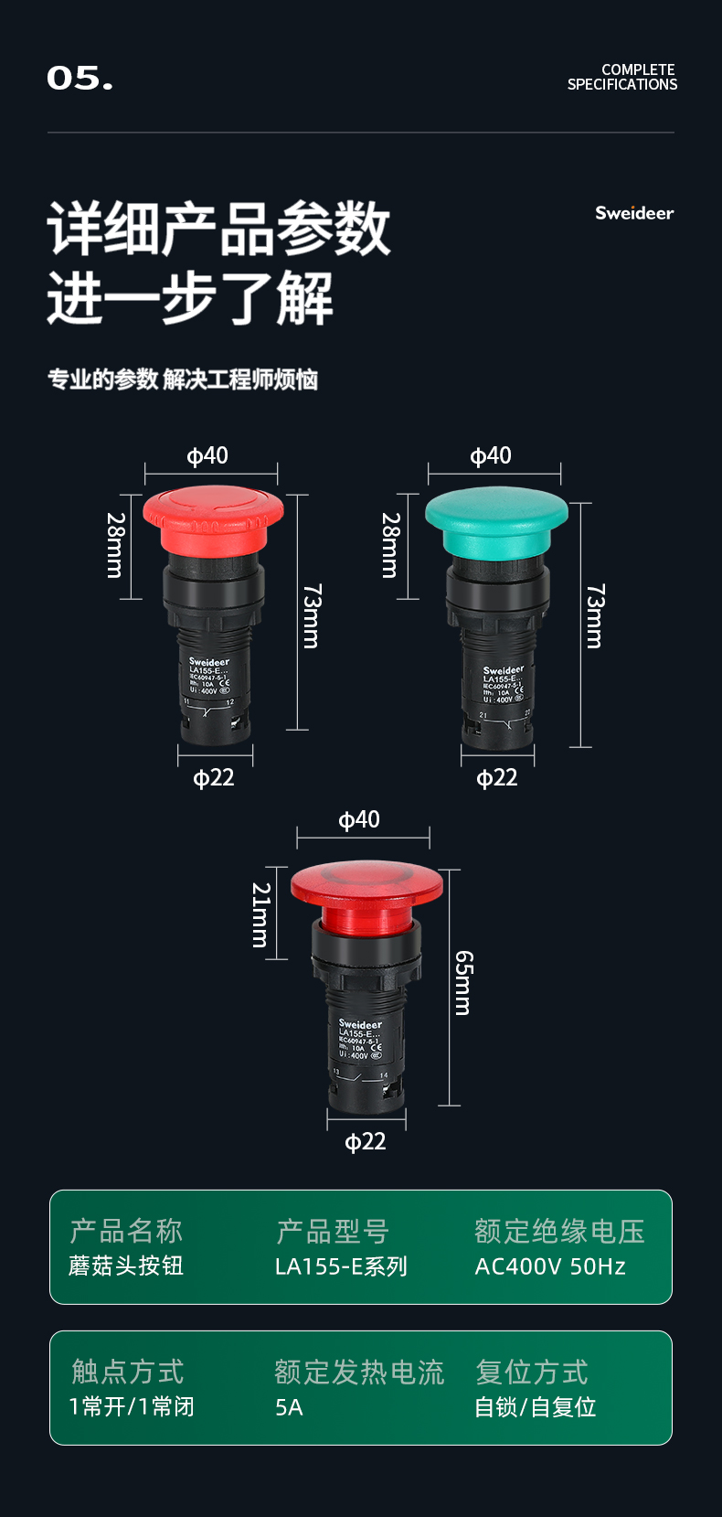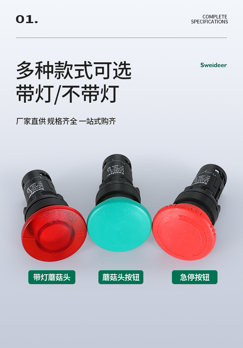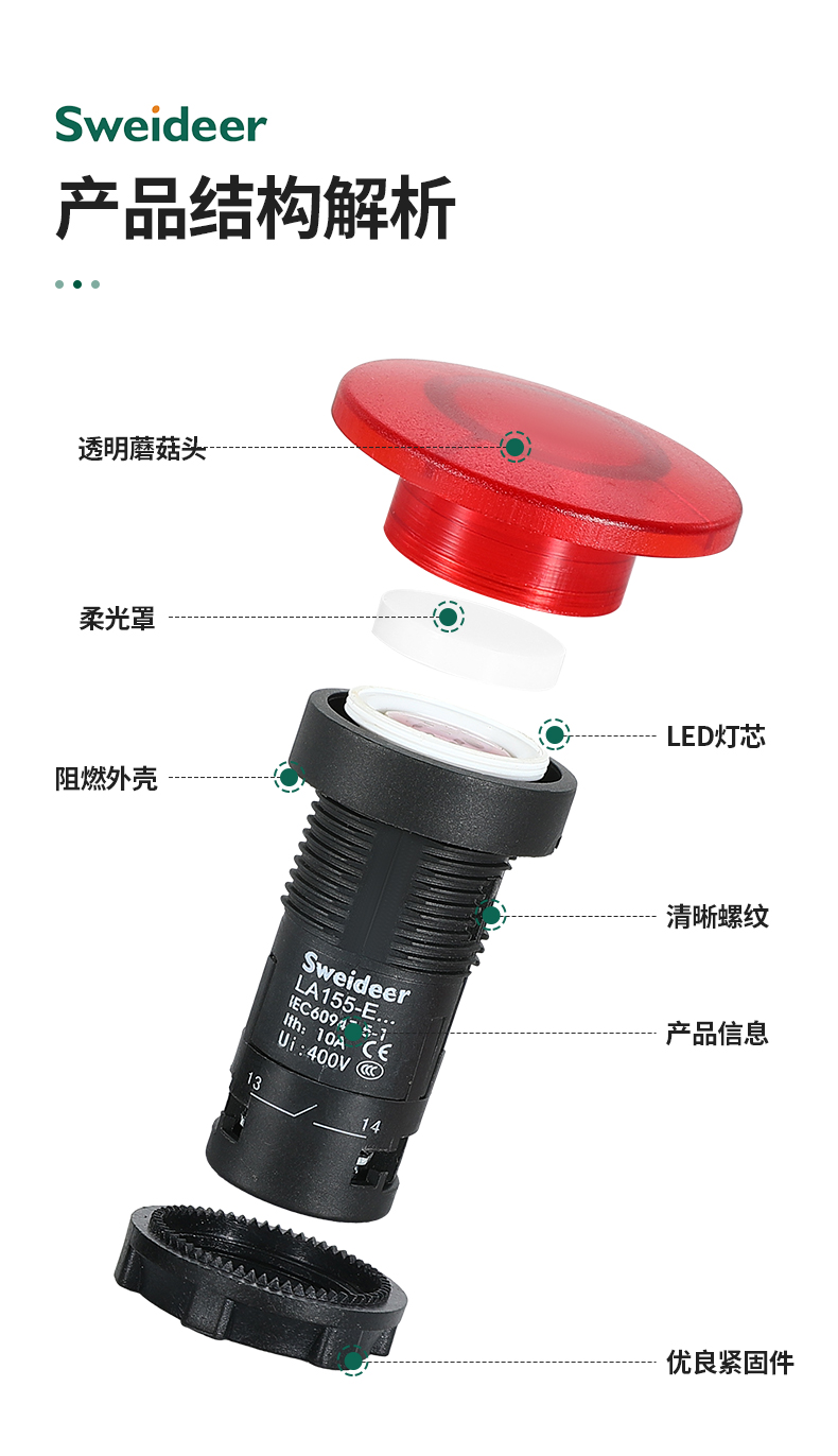 LA155-E3系列Sweideer一体式开孔22MM急停按钮开关带自锁蘑菇头自复位点动按钮