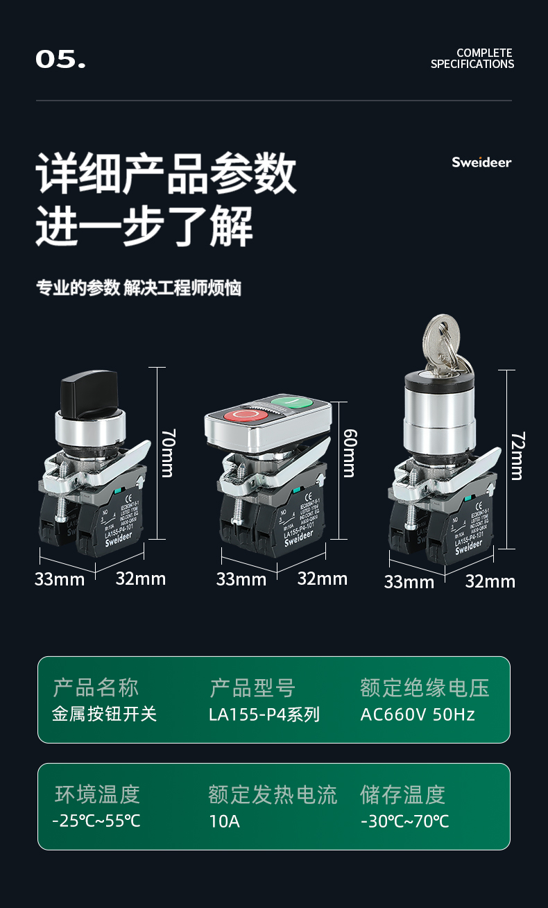 LA155-E3系列索维一体式平头按钮开关自复点动式急停按钮开关旋钮开关二档三档